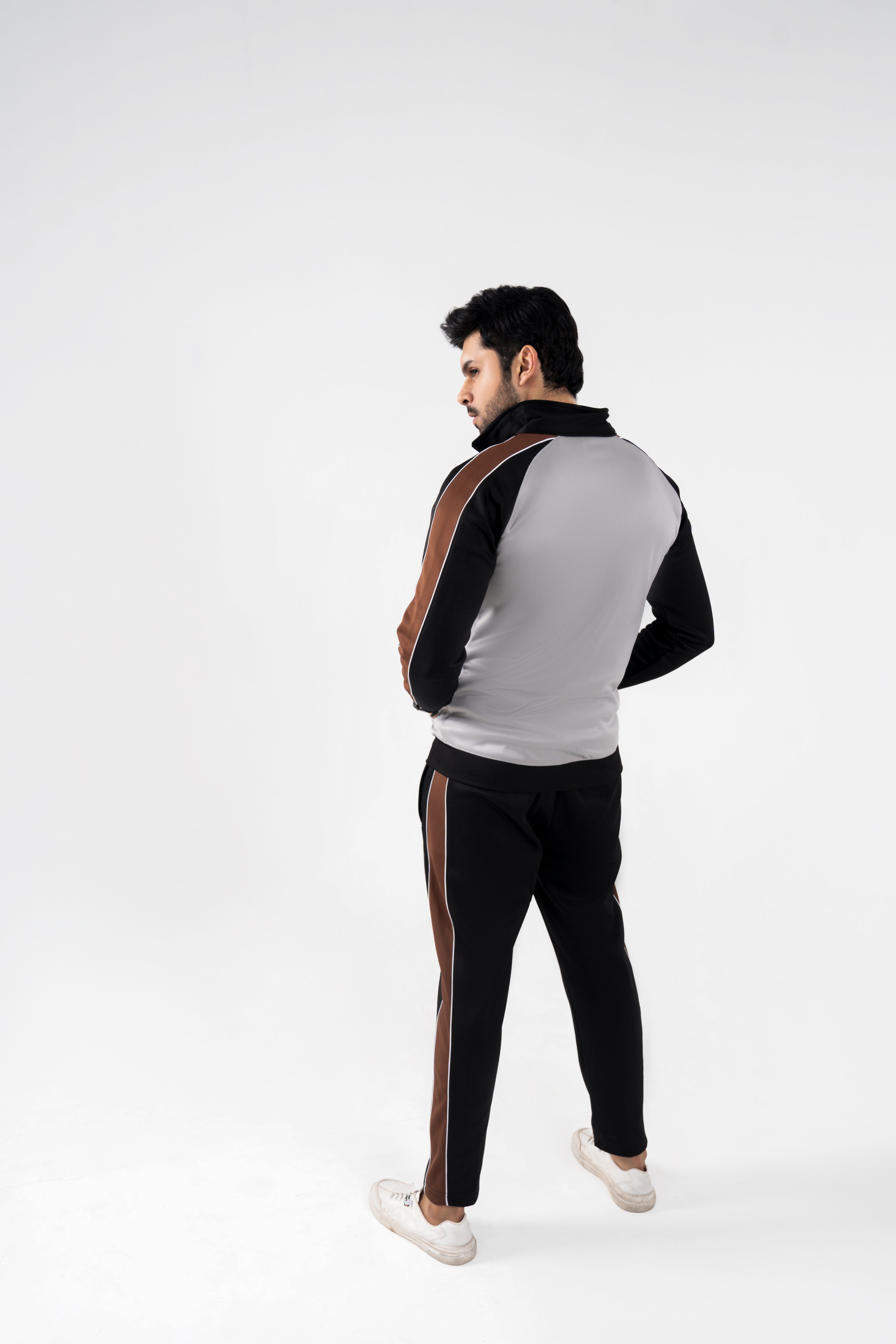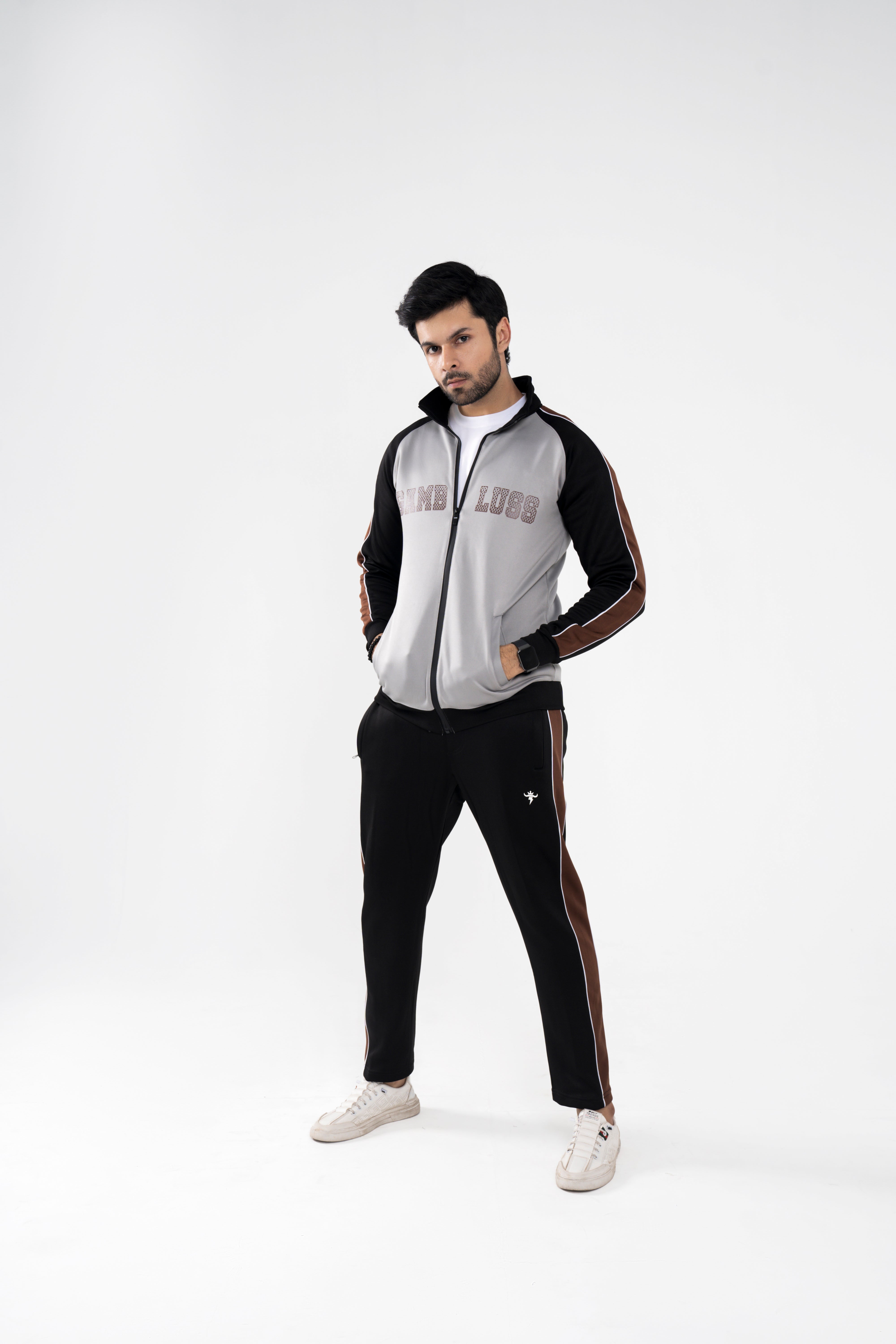Crafted from premium polyfleece fabric, it ensures a soft, warm, and breathable experience — perfect for cool-weather outings, travel, or daily streetwear. The dynamic grey and black combination, accented with brown side stripes, gives it a distinct, athletic-luxury edge.