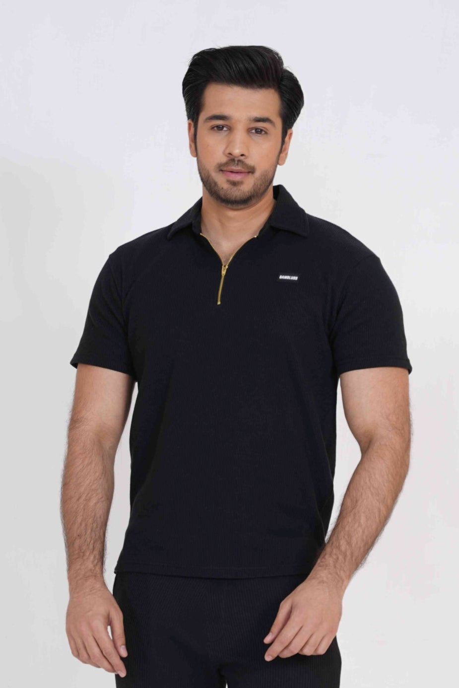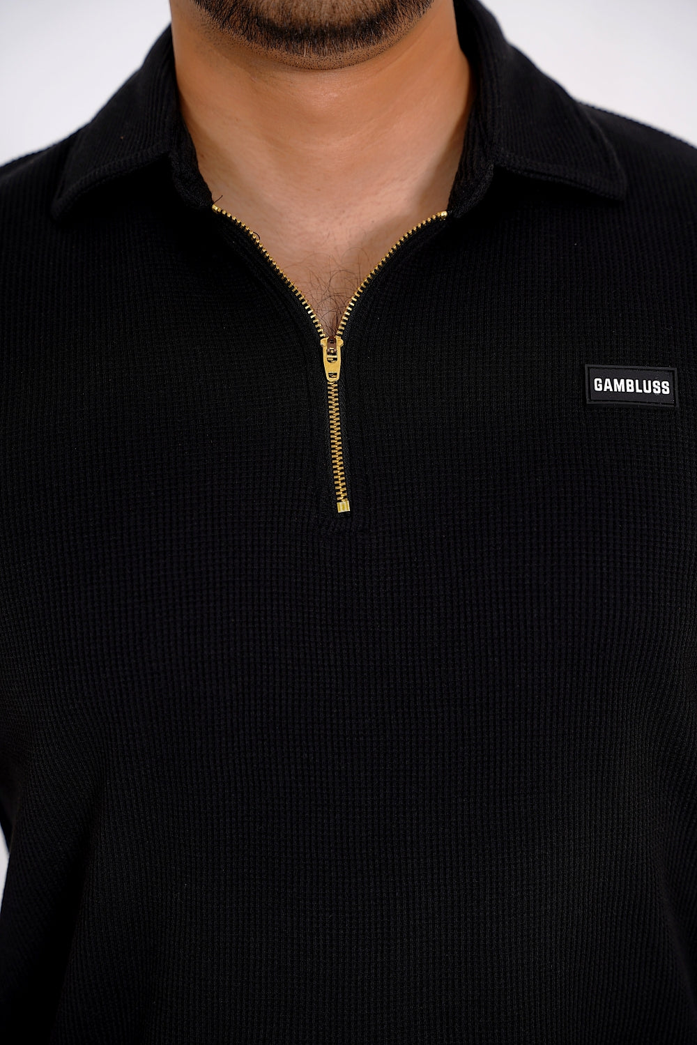 Gambluss Thermal Zipper Polo – Black (Down Needle Knitted Fabric)